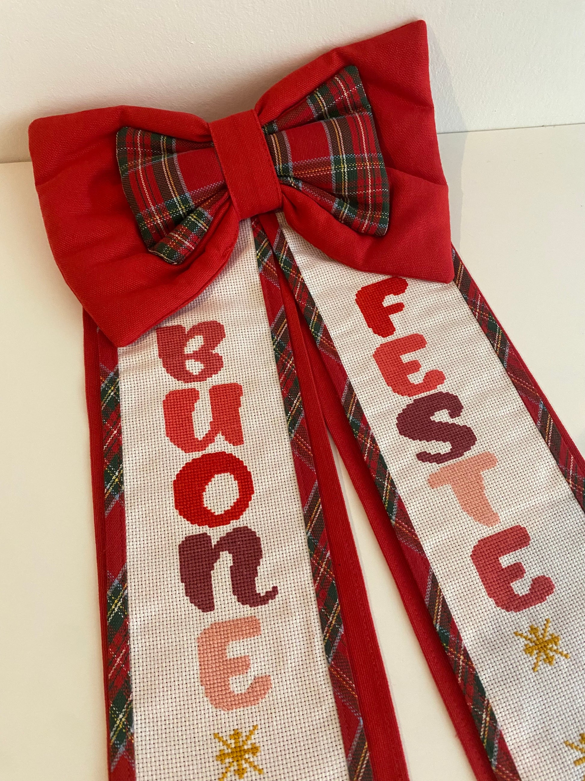 Elegante fiocco da appendere realizzato interamente a mano, con ricamo “Buone Feste” su tela aida. Il fiocco in tessuto rosso e scozzese dona un tocco natalizio caldo e tradizionale, impreziosito da piccoli dettagli ricamati e applicazioni decorative. Perfetto per accogliere gli ospiti con un augurio speciale e aggiungere un tocco artigianale alle decorazioni di Natale.